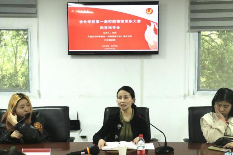 4月4日中午,球盟会第一届校园模拟求职大赛动员指导会在群贤楼215会议室召开。本次动员指导会特邀天健会计师事务所(特殊普通合伙)湖北分所的行政部经理刘萍为同学们做就业指导讲座。