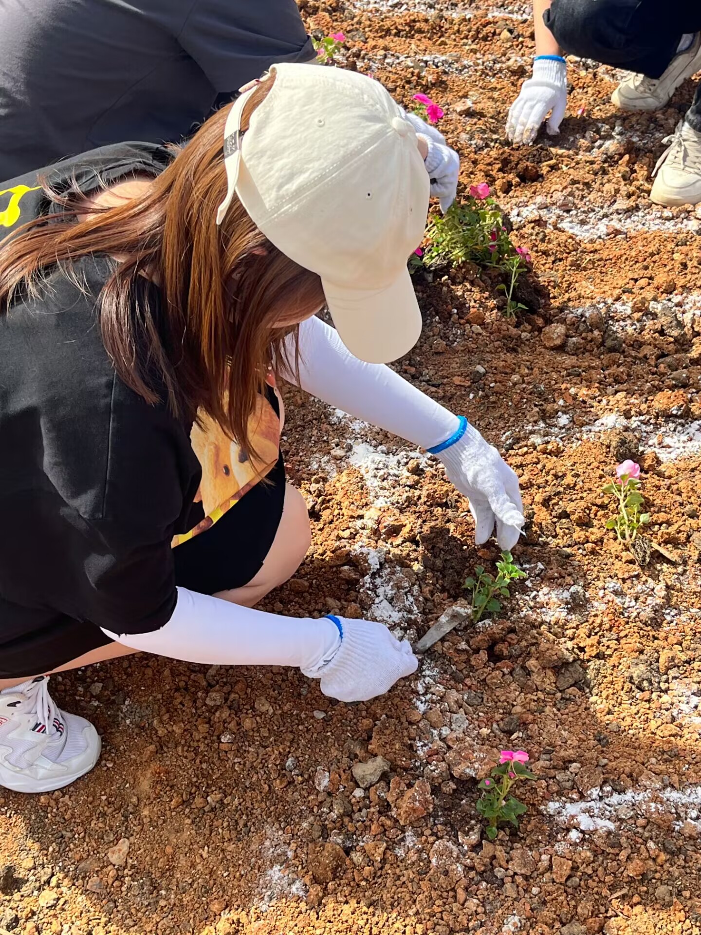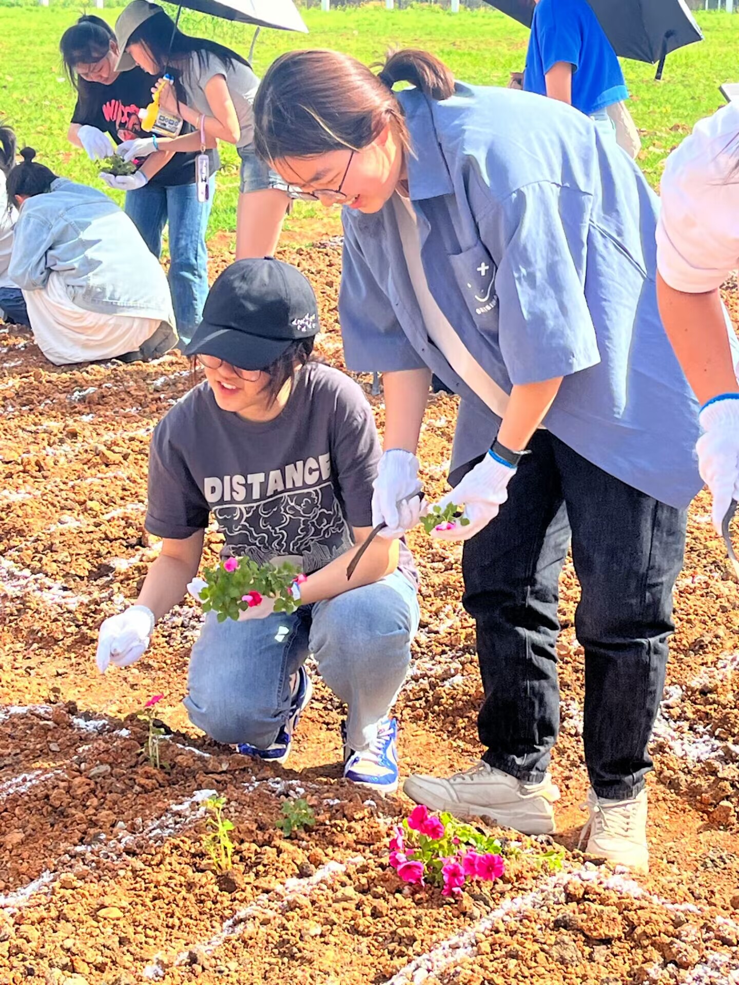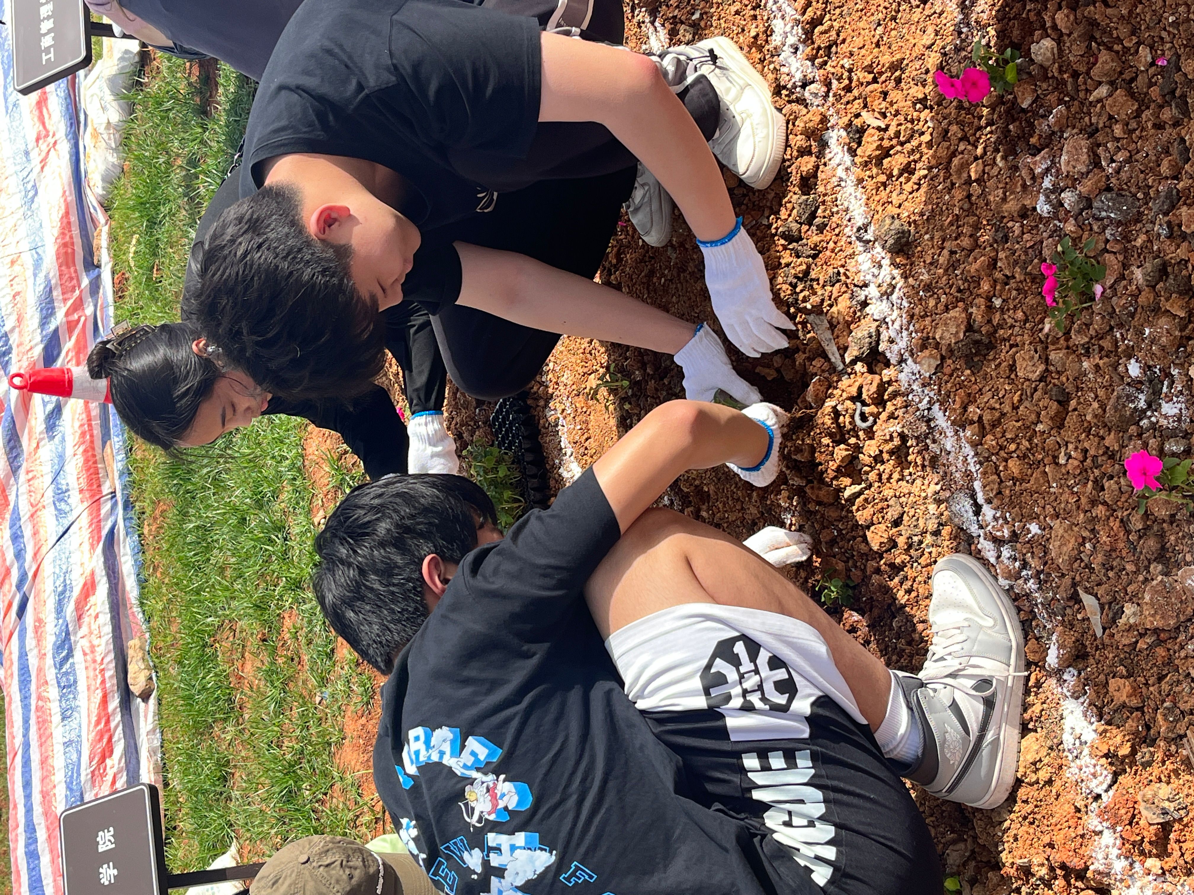 花卉种植现场,到处都是忙碌的身影。同学们两两一组,戴上手套,拎着水桶,半蹲在地侍弄花卉。花卉易折,唯有小心对待、细心栽培方能成活,作为球盟会的员工,细心和严谨正是不可或缺的品质。