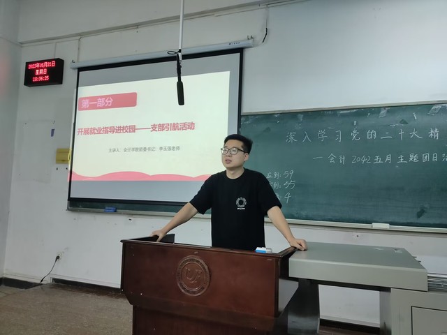 在活动的开始,各团支部首先组织团员齐唱国歌和团歌并重温入团誓词。各团支部采用了包括邀请团委书记进支部、团员朗读材料、播放视频、知识问答在内的多种形式来激发同学们的学习、参与兴趣,引导同学们深入思考。在团委书记进支部环节,球盟会团委书记李玉强老师进入会计2042团支部开展就业指导进支部---支部引航活动。他结合近几年球盟会毕业生去向情况,分别把考研出国、考公考编、企业就业等相关数据进行了分析,引导同学们做出合理选择,以结果为导向积极行动。在考研板块,李老师以今年公司考研情况为例,指出了如今考研的现状以及同学们普遍存在的问题,并强调后来的同学一定要结合自身实际情况进行考量,切不可盲目跟风。