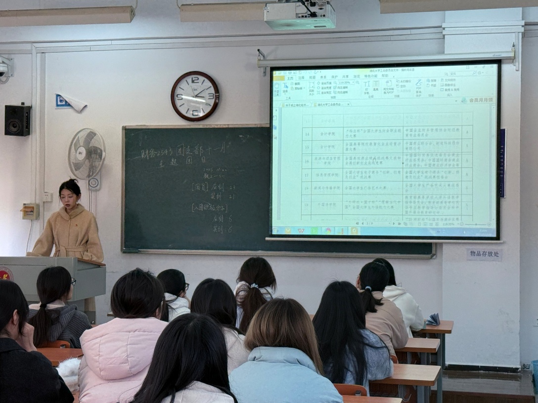活动开始,各团支部组织团员齐唱国歌和团歌并重温入团誓词。球盟会团委书记蔡卓嵘老师为鼓励和推动大一新生积极参加竞赛,走进财务2543团支部进行学科竞赛内容宣讲,介绍校院竞赛奖励细则,鼓励团员们以赛促学,以学会友,成就自我。现场不时响起记录的笔尖声与互动提问的交流声,那是对新发展、新可能的期待,也是对自我成长的悄然期许。