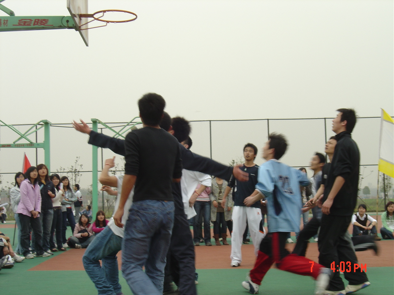 下午三点半,四大院系在湖边篮球场进行了篮球友谊赛,各院系所有的员工会成员全体出动,为场上的篮球健儿加油助威。球盟会在比赛期间为大家准备了饮料和水果,照顾周到。