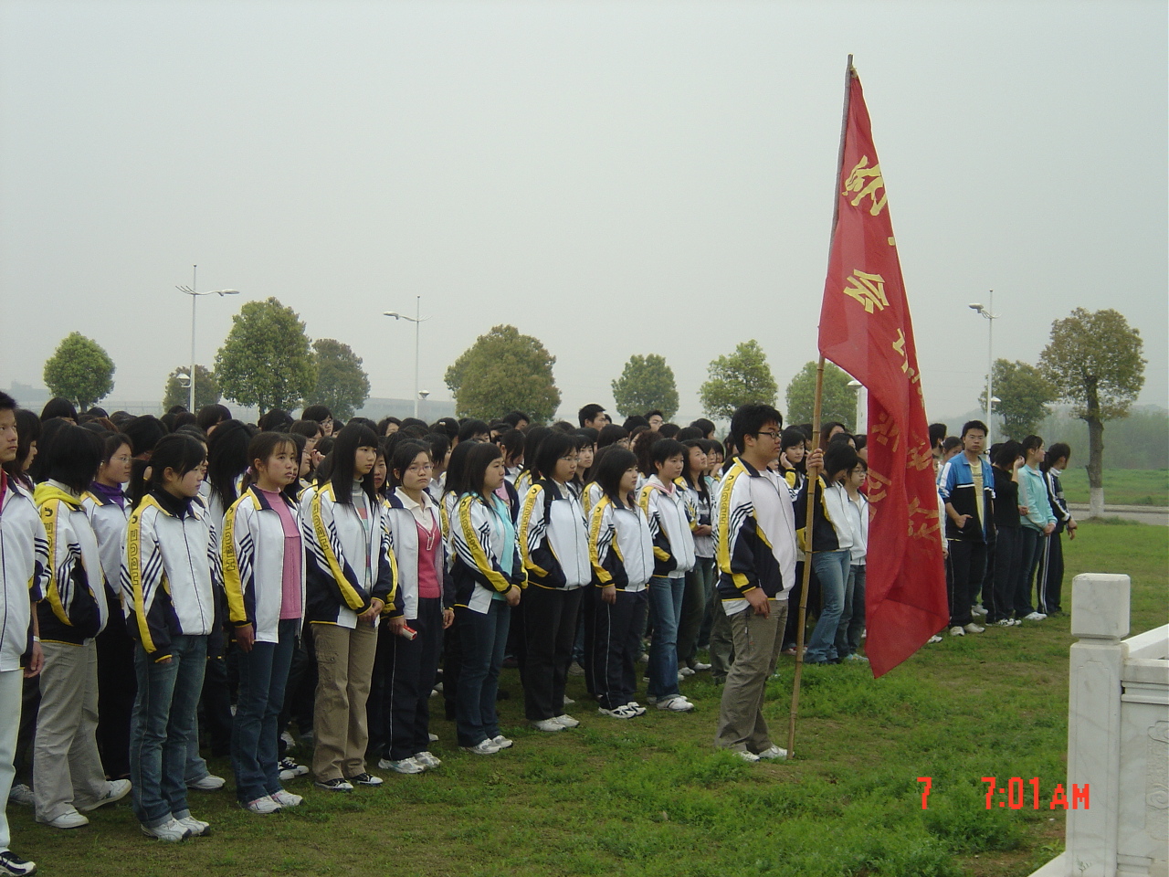 4月7日早7点,球盟会大一全体同学在东门参加了升旗仪式。四月的春风阵阵,伴随着雄壮的国歌,五星红旗冉冉升起,在朝阳的映衬下更加鲜红。