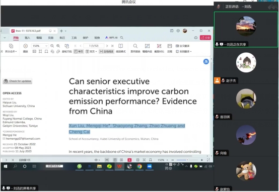 会上,团队负责人刘迅教授分享了他最新研究成果Can senior executive characteristics improve carbon emission performance? Evidence from China”。刘教授重点分享了他写作过程中对企业高管和碳高排放量企业的样本选择,对建立多元线性回归方程模型的变量和考虑因素,以及对所选样本的统计分析与研究,同时还分享了论文写作、投稿及多轮修改的心得。与会的老师和同学进行了热烈的讨论,气氛活跃。