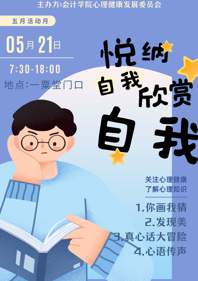 活动通过线上官Q宣传,吸引了大批同学的关注。线下摆点活动于5月21日开始,为期一天。活动中有许多精彩有趣的游戏内容,如你画我猜、发现美、真心话大冒险、心语传声等。本次活动旨在让同学们认识、接受并喜欢客观的自己。积极地悦纳自我,不根据他人的眼光来选择自己的生活状态,找到适合自己的道路,进行自我提升和自我实现才是最重要的。此次活动减轻了同学们在繁重的期末复习中的压力,让同学们发现身边的美,感受到老员工活的多姿多彩。